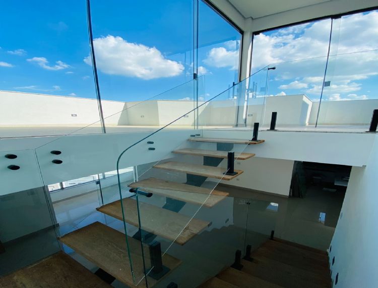 Fachada imponente em pele de vidro, piso em porcelanato, pias esculpidas, luzes LED embutidas e escada em madeira e blindex.